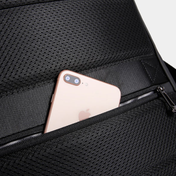 Le sac dispose d’un port USB externe relié à un câble interne. Pour l’utiliser : insérez une batterie externe dans le compartiment prévu, branchez-la au câble interne, puis connectez votre appareil au port externe. Batterie externe non incluse. Le choix de la batterie vous appartient, ce qui permet la conformité avec les règles de transport aérien.